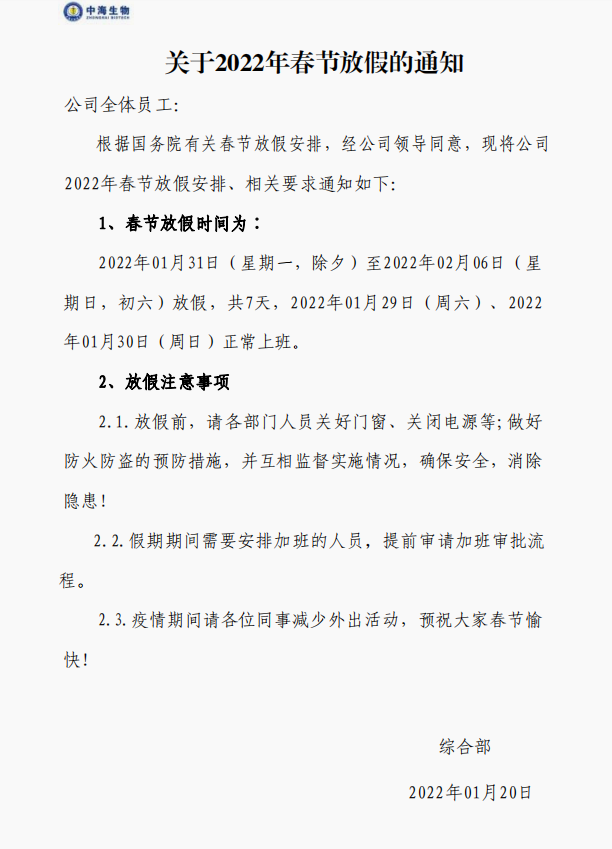 中海生物公司2022年春節(jié)放假安排通知