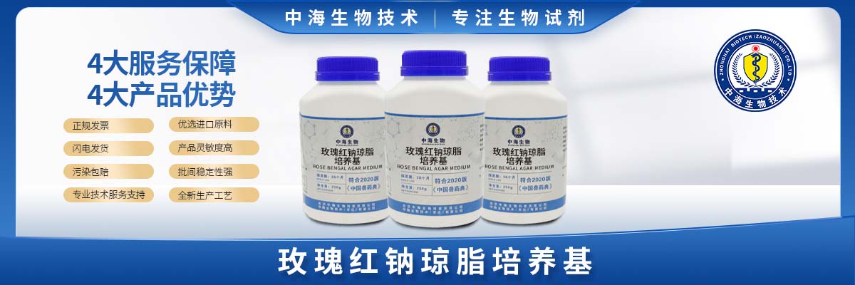 中海生物技術(shù)玫瑰紅鈉瓊脂培養(yǎng)基含有蛋白胨、葡萄糖、磷酸二氫鉀、硫酸鎂、玫瑰紅鈉和瓊脂粉成分,其原理是由蛋白胨在培養(yǎng)基中作為營養(yǎng)物質(zhì)提供菌體生長所需的氮源和碳源;葡萄糖提供能源;磷酸二氫鉀為緩沖劑,起著緩沖培養(yǎng)環(huán)境pH值的作用;硫酸鎂提供必須的微量元素;玫瑰紅鈉是一種指示劑,具有一定抑菌作用的選擇性成分,所以作為選擇性抑菌劑可抑制細(xì)菌的生長,并可減緩某些霉菌因生長過快而導(dǎo)致菌落漫延生長。